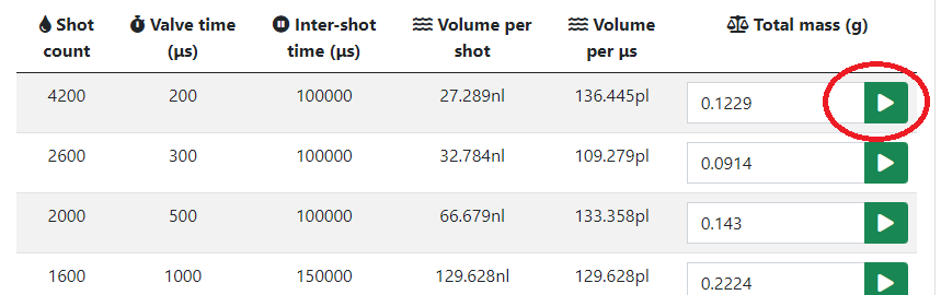 next to the green “play”/run button. You will notice the volume-per-shot and volume-per-us will be calculated