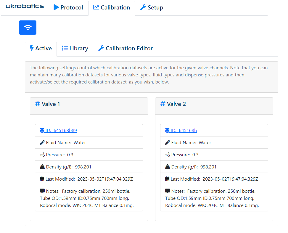 The software will maintain a library of the calibrations, when you wish to dispense a given fluid type you can select and activate the appropriate calibration on to any of the valve channels you wish.