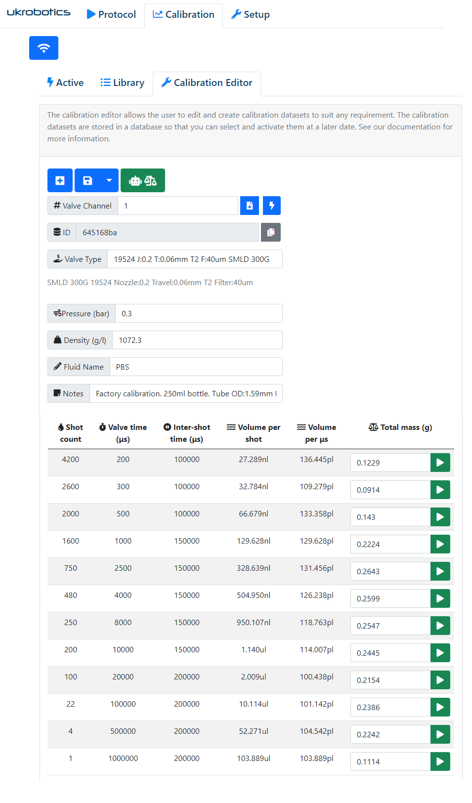 The following screen shot shows the second half of the calibration editor, this section shows the ‘calibration table’ which contains a table of valve open times against mass which ultimately is used to provide an interpolation table that can map a desired dispense volume into the valve open time which will dispense the desired volume.