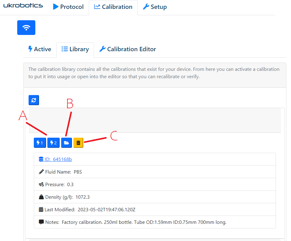 The calibration library view provides a list of all the available calibration types for your D2. You can see key details of the calibration such as the fluid name, pressure, last modified date and any notes. In addition, you can click the ID to open and view the calibration in the editor